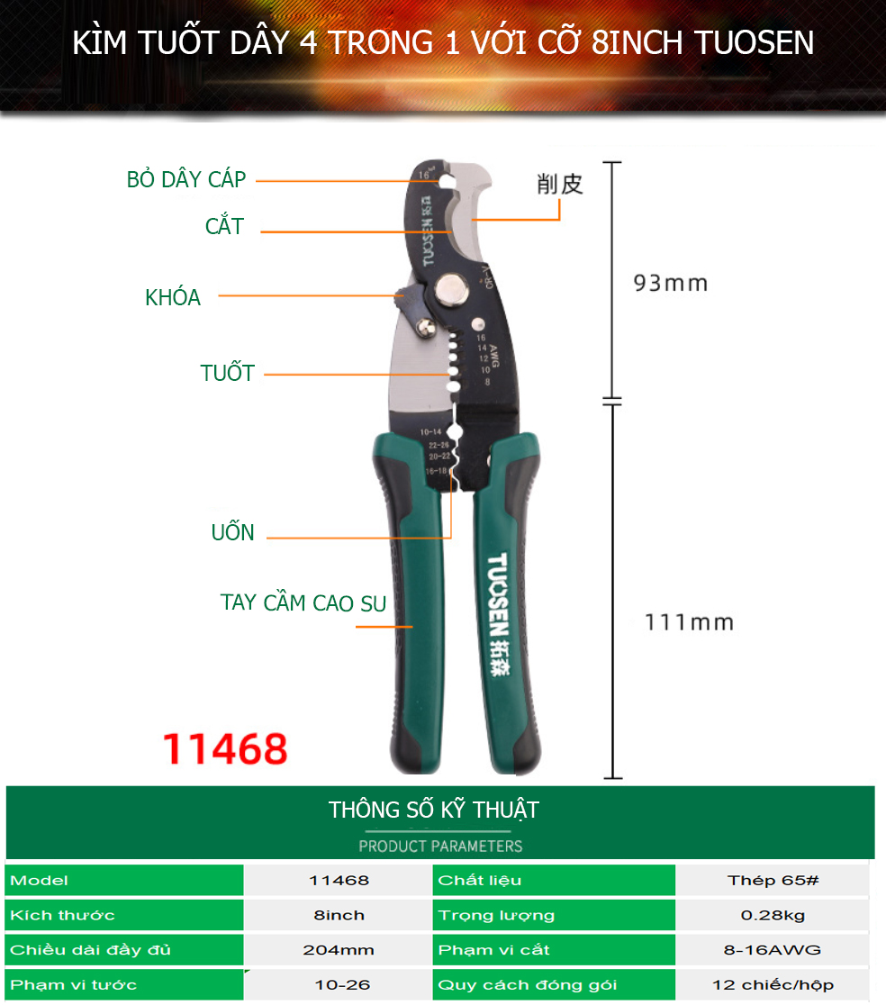 – Thiết kế vít có khía ở đuôi kìm mạnh mẽ, có thể điều chỉnh kích thước mở